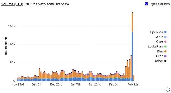 Odaily星球日报讯 据数据显示,NFT市场OpenSea交易量于2月20日暴涨15倍,为 13.5万枚ETH,大幅超过Blur5万枚ETH的交易量。据DEGEN NEWS表示,交易量大幅增加由NFT项目Mech Minds推动。