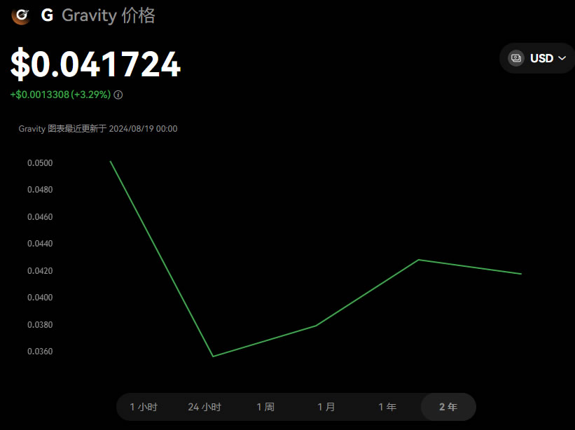 截止 8 月 20 日,G 币的交易价格为 $0.041724,在过去 24 小时上涨 3.29%。
