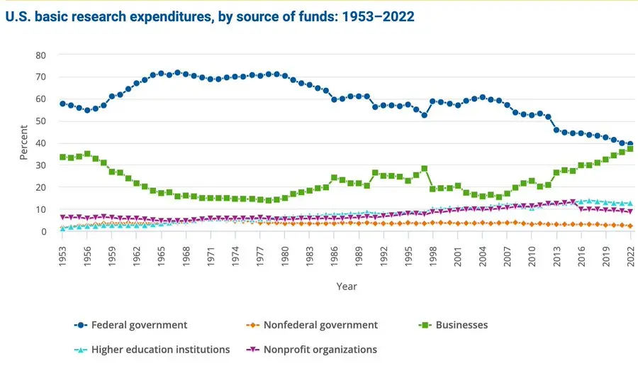 传统的科学资助体系效率低下。科研人员高达40%的时间用于申请经费,成功率却不足20%。政府资金减少,私人资金虽然增加,但主要掌握在大企业手中。