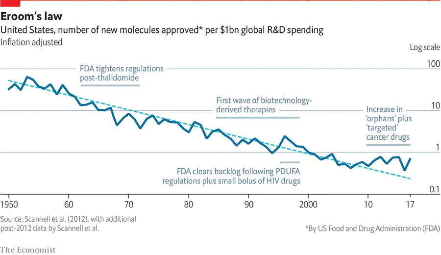 以艾伯维的修美乐为例,该药年收入超过200亿美元。其原始专利于2016年到期,但艾伯维却提交了100多项额外专利,延缓了仿制药的上市,导致患者和医疗系统付出巨额代价。Tarun Chitra和benjels在DeSci辩论中也指出制药创新停滞的问题,并援引了Eroom法则(摩尔定律的反面)。