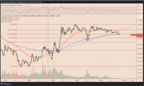 最近,以太币(ETH)相对于比特币(BTC)的价格跌到了近15个月以来的最低点,这也是以太坊转向权益证明(PoS)机制后的最低水平。这引发了人们的疑问:以太币在今年剩余的时间里会继续走弱吗?让我们一起来看看图表分析。