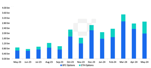 不仅如此,某交易所的以太币期货期权交易量也在5月份创下新高。数据显示,该交易所的ETH期权交易量飙升115%,达到9.31亿美元,远超4月份的6.1575亿美元,刷新了月度交易量纪录。