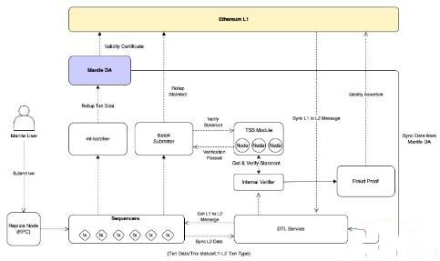 Mantle 的数据可用性 (DA) 节点由 EigenLayer 的 EigenDA 模块提供支持。它们存储汇总交易的记录,使 L1 和 L2 的验证者都可以访问它们。验证者可以在防欺诈挑战期间从 DA 节点检索数据或交易。Mantle DA 节点也向 L1 网络发布数据有效性证明。