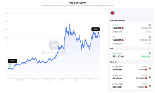 这位投资者最初的投入并不算大,但凭借着对市场的敏锐嗅觉和坚定的持仓信心,最终获得了如此丰厚的回报。据SpotOnChain透露,这位大佬去年11月开始布局,以平均价格购入了169万枚RNDR,然后就淡定地等待时机。