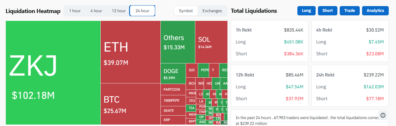 根据 CoinGlass 的数据,这次抛售引发了一波强劲的多头清算浪潮。短短 4 小时内,超过 1.0281 亿美元的仓位灰飞烟灭。24 小时内,超过 67,976 名交易者惨遭清算,总额高达 2.3923 亿美元。