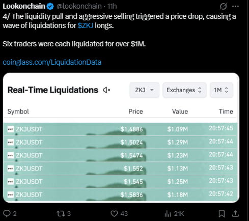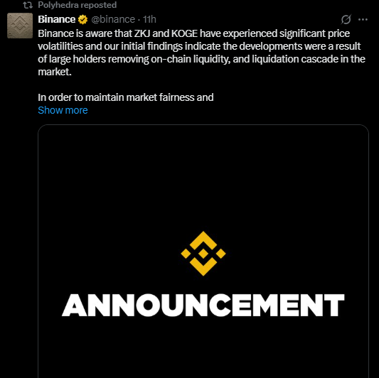 交易所也注意到了这场风波。他们承认 ZKJ 和 KOGE 的价格波动剧烈,并将其归咎于大户持有者削弱了流动性,从而引发了一系列清算。
