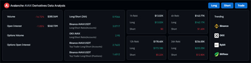围绕 AVAX 的交易情况呈现出一种奇怪的分裂。数据显示,交易量大幅下降了 60%,表明市场活动显著减少。多空比率相对平衡进一步证实了这一点,表明交易员对 AVAX 的未来普遍犹豫不决。
