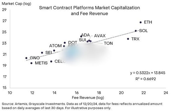 衡量智能合约平台价值的一个重要指标是网络费用收入。当然,TVL(总锁定价值)也很重要,但灰度认为,对于公链来说,费用收入才是关键。智能合约平台的手续费收入和市值之间存在正相关关系,也就是说,一个网络产生费用收入的能力越强,它就越有能力以代币销毁或者质押奖励的形式把价值传递给网络。这也是为什么灰度在第一季度特别点名ETH、SOL、SUI和OP的原因。