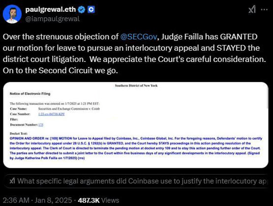 Coinbase 法务长 Paul Grewal 在社交媒体上表达了对法官 Failla 决定的感谢:“不顾 SEC 的强烈反对,法官 Failla 已批准我们提出中间上诉的请求,并暂停当前的诉讼程序。我们感谢其审慎考量。接下来,我们将前往第二巡回法院!”