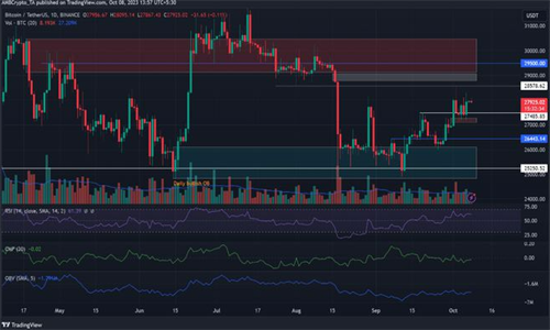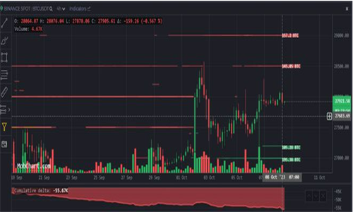 比特币似乎有重新测试价格失衡或流动性区域的趋势,价格波动不定。自10月2日以来,买家们利用$27,000至$27,200之间的价格失衡区间(橙色区域),重新进入市场。