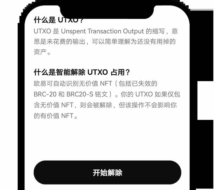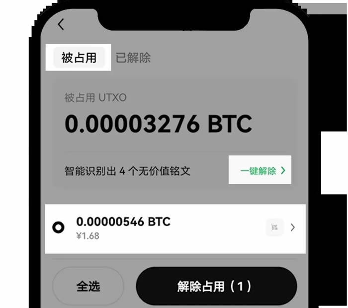UTXO 是未花费的输出,可以简单理解为还没有用掉的资产。如果你想解除 UTXO 占用,你可以在首页点击首页【BTC】-【UTXO】,选择要解除的被占用的 UTXO,然后点击【解除占用】。你也可以选择【一键解除】按钮,针对无价值铭文智能解除 UTXO 占用。