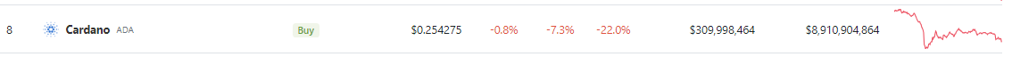 当前,比特币 (BTC) 的交易价格徘徊在 25,000 美元以下,对整个加密货币市场产生了深远的影响。BTC 的价格下跌引发了山寨币的连锁反应,ADA 也不例外。截至目前,ADA 在 CoinGecko 上的价格为 0.259126 美元,仅在过去 24 小时内就下跌了 7.3%,导致 7 天内大幅下跌 22%。这些数据清楚地展示了比特币价格走势与山寨币表现之间的紧密关联。