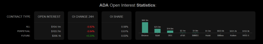 根据 Coinalyze 在四小时时间范围内的数据,ADA 的未平仓合约 (OI) 一直在减少。这表明市场投机者对 ADA 潜在的看涨反弹缺乏热情。