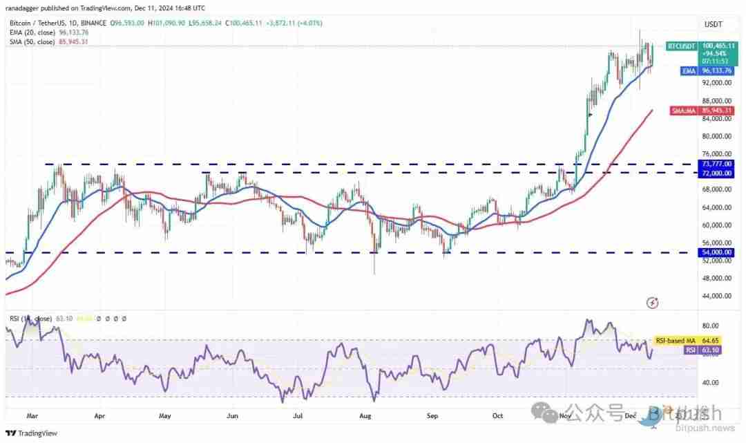 图表分析师Upadhyay认为,比特币价格从20日均线(约96,133美元)处强势反弹,显示出多头力量依然强劲。如果能有效突破101,351美元至104,088美元的阻力区间,将进一步确认上涨趋势。届时,比特币有望冲击113,331美元,甚至挑战125,000美元关口。不过,若价格跌破20日均线,则可能引发获利盘抛售,导致价格回落至90,000美元一带。因此,90,000美元是多空双方争夺的焦点,也是一个重要的支撑位。