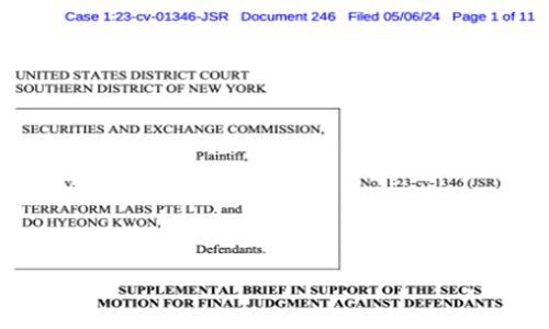 5月8日的最新消息表明,美国证券交易委员会(SEC)的律师已对Terraform Labs最近提出的关于民事案件判决后补救措施的备忘录作出正式回应。在5月6日提交给美国纽约南区地方法院的文件中,SEC明确驳回了Terraform试图在民事案件判决中减少非法所得的论点。陪审团此前已认定Terraform对此负有责任。SEC的律师指出,Terraform及其联合创始人Do Kwon在法庭上从未提出过关于SEC对美国境外代币发行和销售强制执行联邦法律域外适用的任何异议。