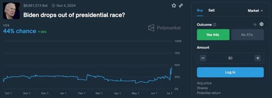 随着事件持续发酵,去中心化预测平台 Polymarket 的数据显示,拜登退选的概率也从周末的 33% 上升到 44%,这场美国大选似乎越来越有可能出现变数。