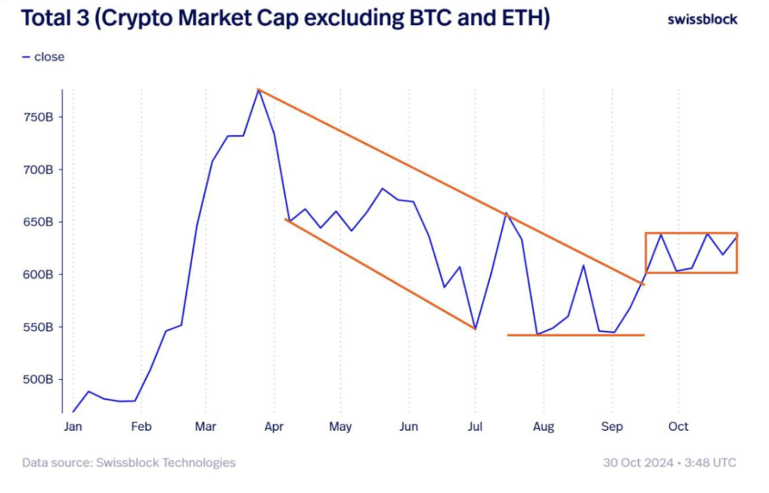 下图展示了今年以来排除比特币和以太坊后的加密市场总市值变化(Total 3),这也代表了山寨币的表现。从4月到9月,山寨币总市值大幅下跌,从7500亿美元跌至5500亿美元。但从9月开始,市值开始止跌回升,升至6000至6500亿美元的区间,打破了下降趋势,这表明我们已经度过了山寨币最低迷的时期。