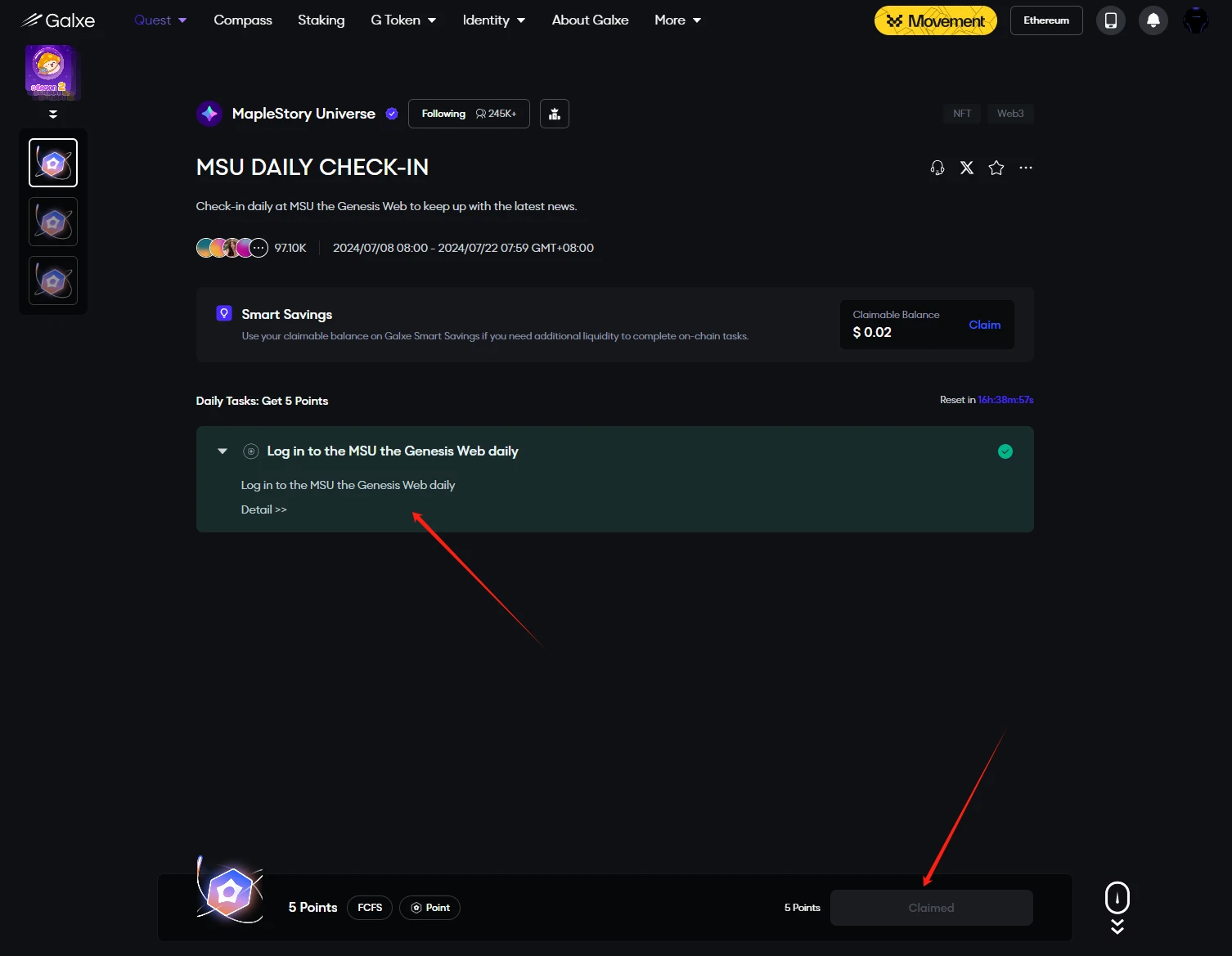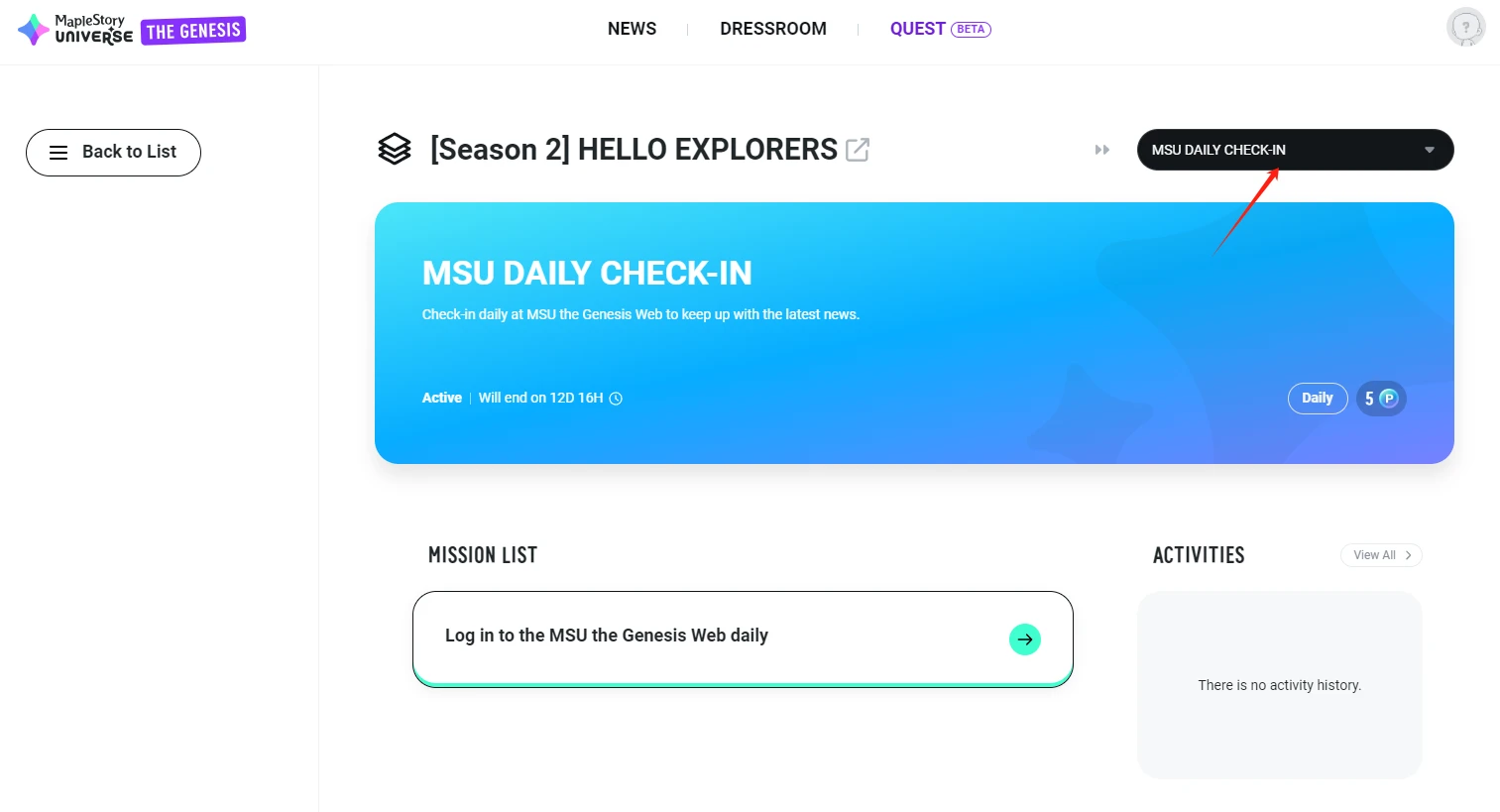 Season 2:HELLO EXPLORERS 中 MSU DAILY CHECK-IN 的任务为每日任务,每天签到可获得 5 积分,该活动截止到7月22 早上 8点。