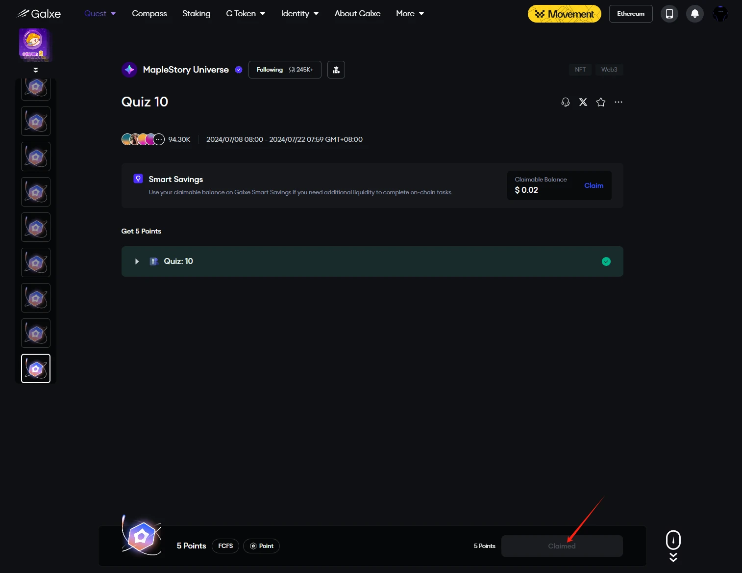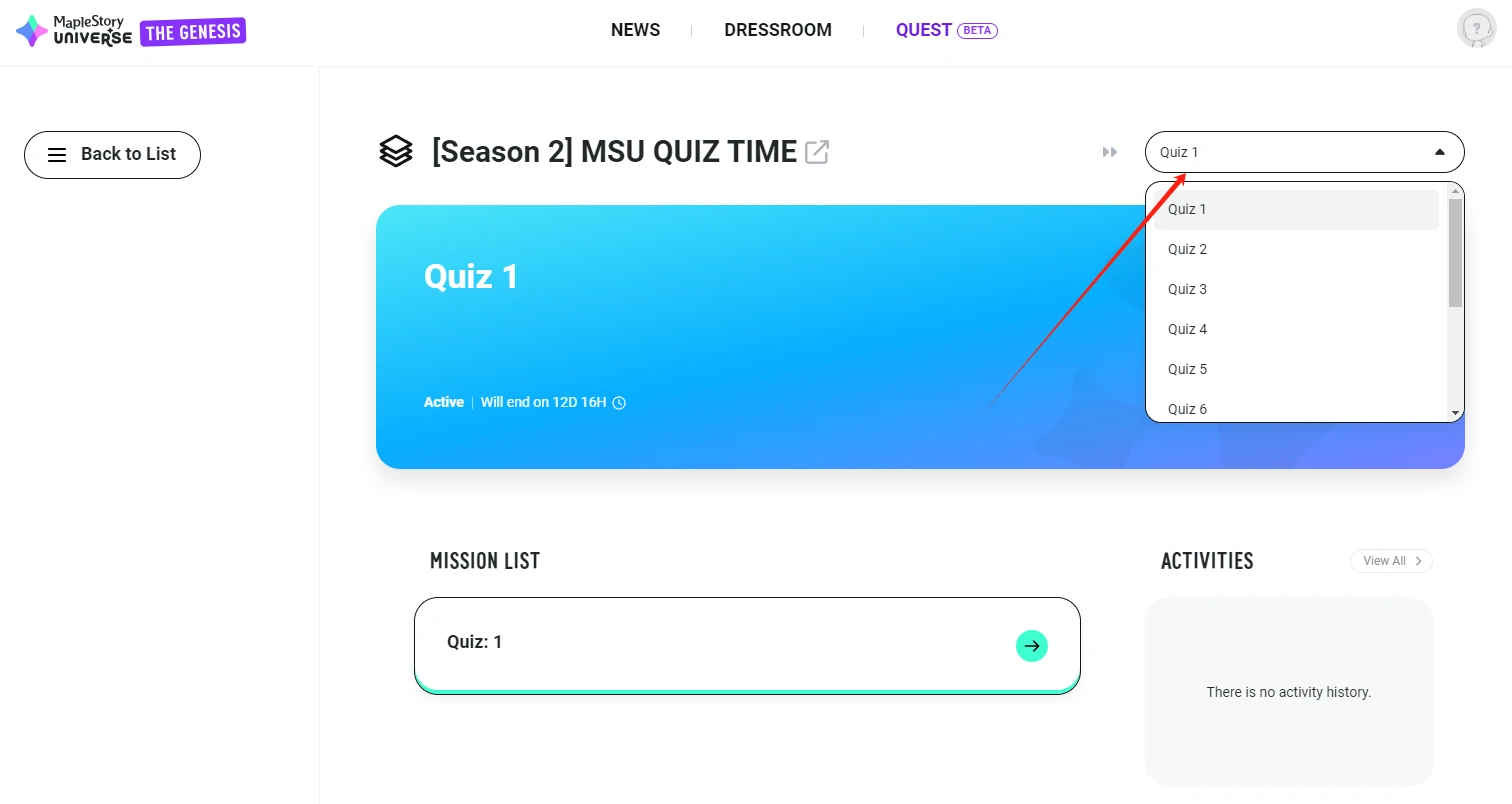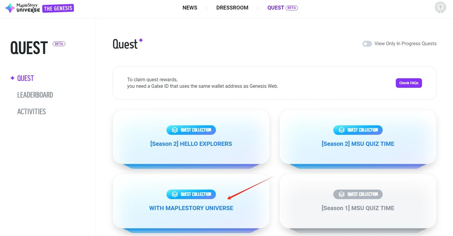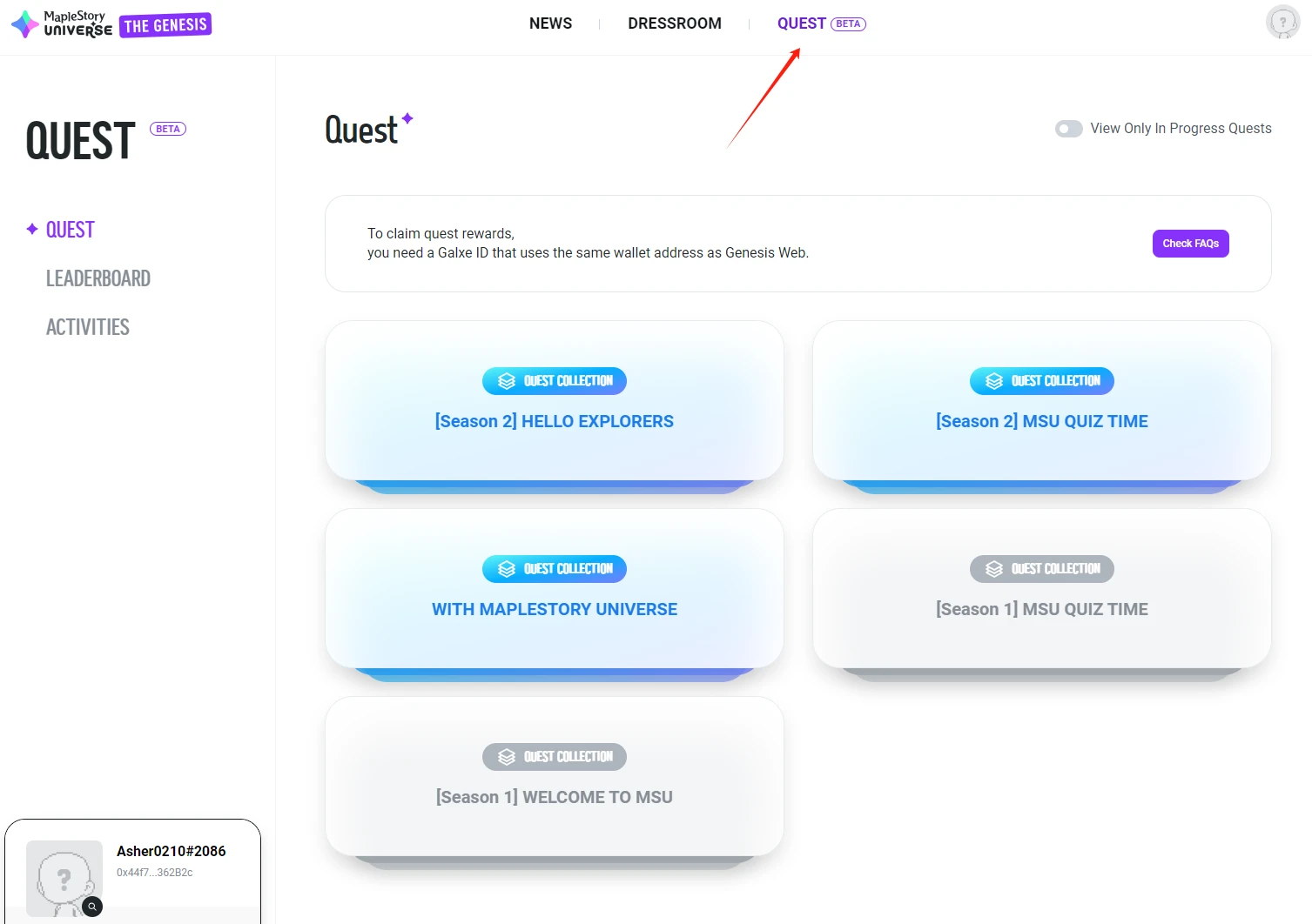 STEP 5. 进入“QUEST”回答问题获得积分奖励,最后进入“WITH MAPLESTORY UNIVERSE”进行任务,该活动截止到7月22 早上 8点。