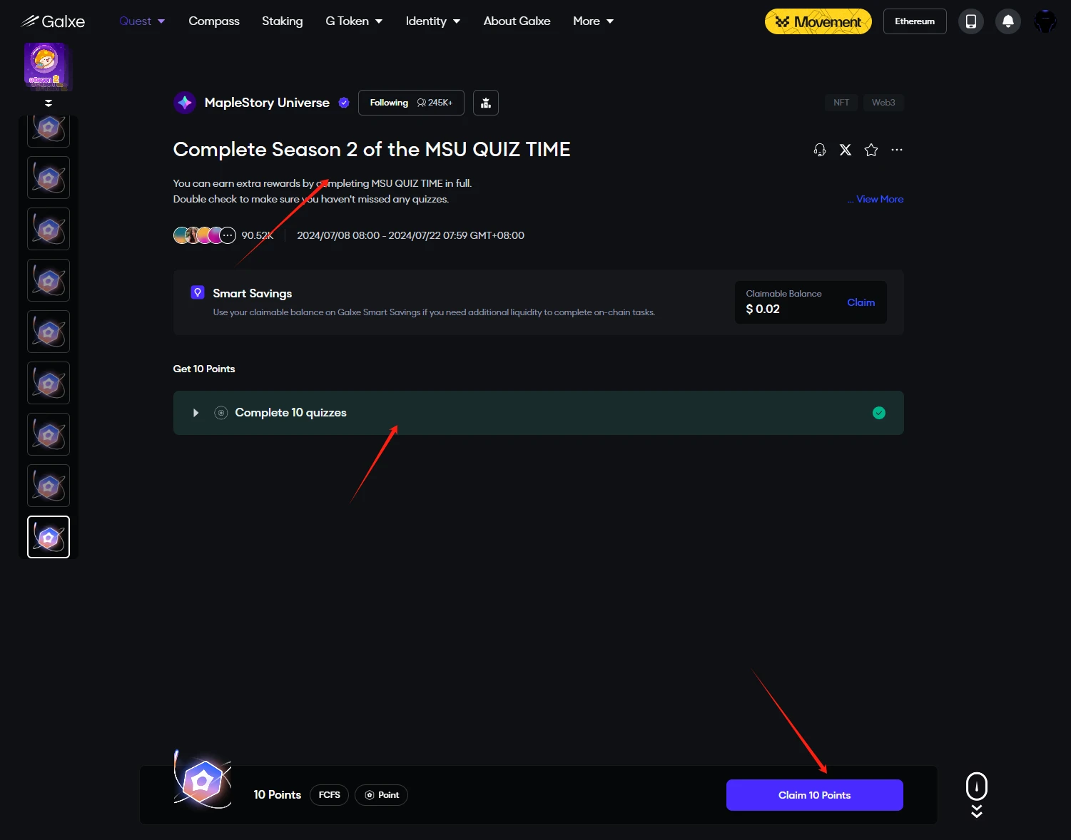 STEP 4. 进入“QUEST”回答问题获得积分奖励,其次进入“MSU QUIZ TIME”进行任务,该活动截止到7月22 早上 8点。