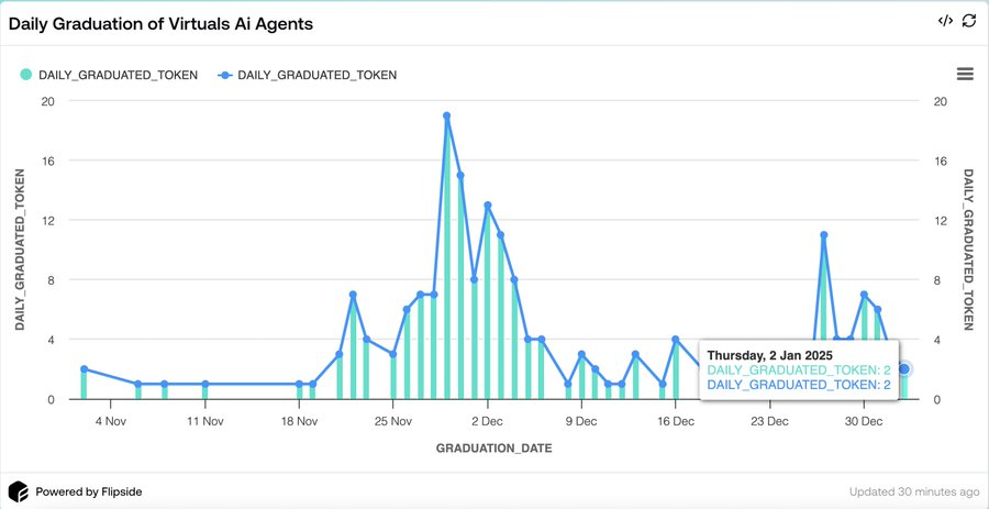 当 Virtuals 平台上的 AI 代理代币市值超过一定数额时,它们将从初始绑定曲线机制中“毕业”。毕业后,这些代币将在 Uniswap 等去中心化平台创建流动性池,从而获得更好的交易流动性。