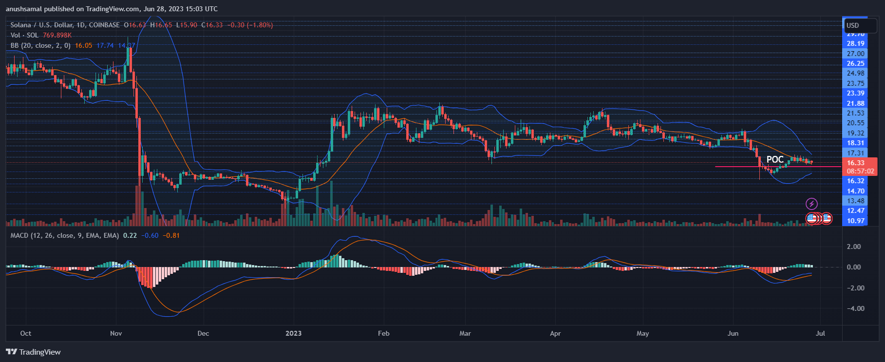 目前 SOL 的交易价格在 16.30 美元附近,之前在 17.30 美元附近遇到了阻力。如果能够成功突破 17 美元,那么可能会进一步上涨至 18 美元。