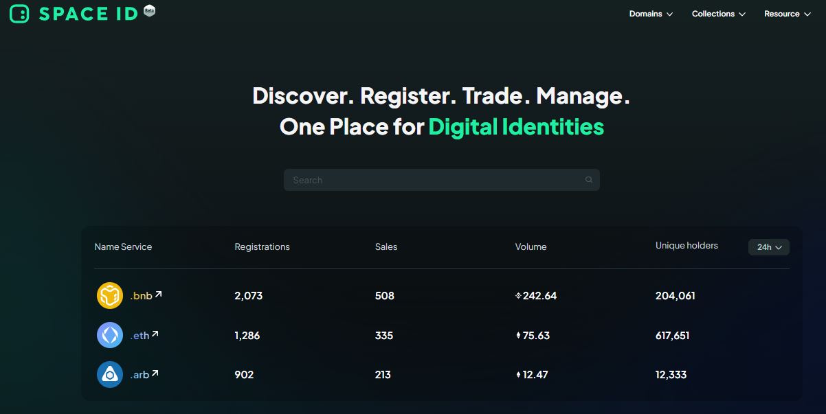 7. Space ID:这是一个多链域名服务网络,允许用户发现、注册、交易和管理 Web3 域名。Space ID 于 2022 年 9 月完成了种子轮融资,并在 6 个月内迅速获得了大量注册和持有者。最近,Space ID 完成了 1000 万美元的战略轮融资,支持以太坊、BSC 和 Arbitrum 等多个区块链。