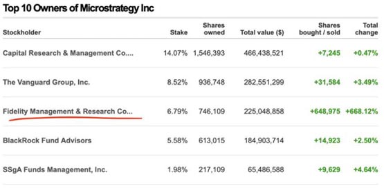 富达如此看好微策略,使得其持股年化比率暴增了668.12%,目前是微策略的第三大机构股东,持股比例达到了6.79%。