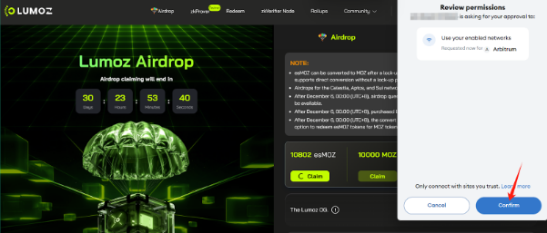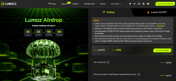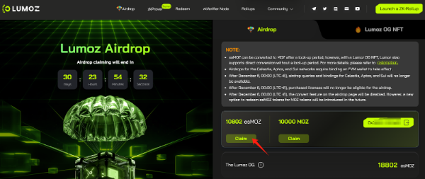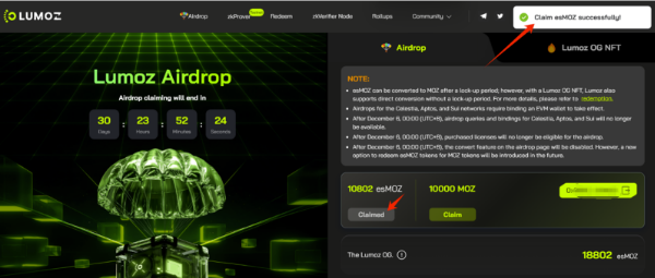 现在,随着 Lumoz Protocol 协议的正式上线,esMOZ 与 $MOZ 代币空投已全面开放申领。