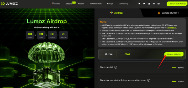 用户可以将 esMOZ 兑换为 MOZ。拥有 Lumoz OG NFT 的用户可以无锁仓期 1:1 直接兑换。不适用 Lumoz OG NFT 的情况下,可根据设定规则完成兑换。