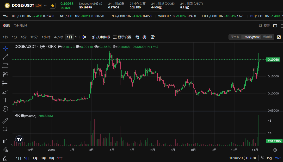 狗狗币(DOGE)作为模因币界的“老大哥”,最近的表现确实让人眼前一亮。数据显示,过去一个月,狗狗币的价格上涨了近55%,价格在0.10美元到0.16美元之间波动。