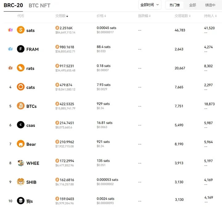 历史累计成交 SATS 交易额达到 8400 多万,而 ORDI 累计成交额才 150 多万,SATS 热度还在持续,但高位接盘也很有可能被套牢。