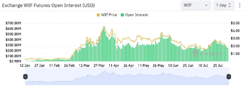 最近加密货币市场整体表现不佳,Solana 上的热门迷因币 Dogwifhat (WIF) 也未能幸免。数据显示,自 7 月 27 日以来,WIF 的未平仓合约 (OI) 显著下降,引发了交易员的广泛关注。