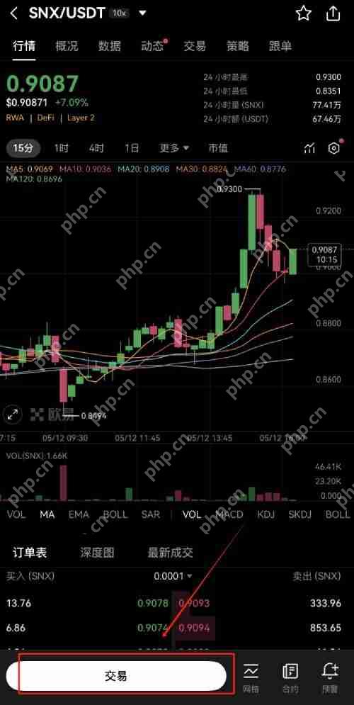 3、进入SNX实时行情页面后,点击左下角的“交易”按钮。