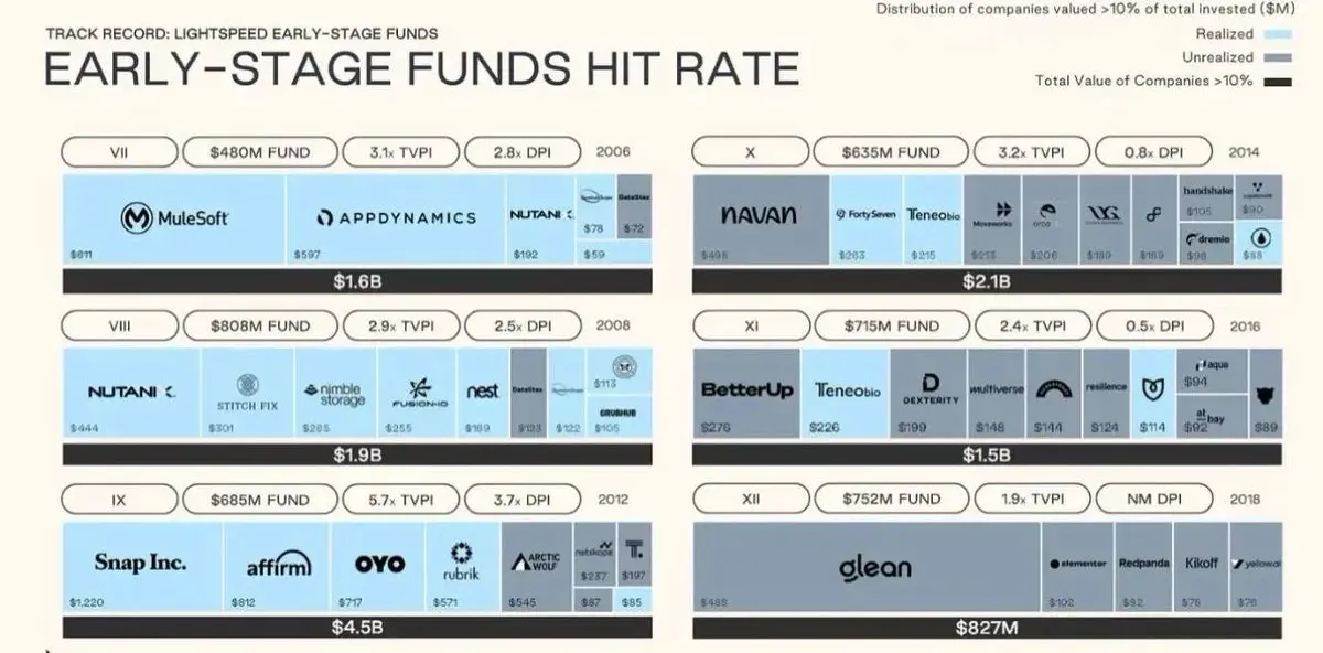 不得不承认,无论是在中国还是美国,VC作为一种投资资产类别,其黄金时代已经过去。Lightspeed的早期基金回报数据就是一个很好的例证:其表现最佳的基金(2012年)投资了Snap、Affirm、OYO,DPI达到了3.7倍。但自2014年以来,连回本都变得困难。(DPI: 已分配回报倍数)