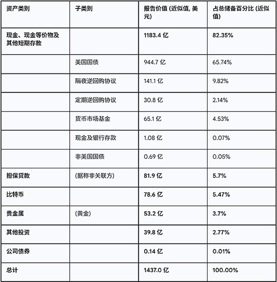 从表中可以得出以下事实:USDT对应的抵押品中,有1183.4亿美元是美国国债、美元现金和其他几乎等同于美元的资产,占总抵押品的82.35%。USDT还有78.6亿美元的比特币(2024年12月,比特币价格在10万美元),占总资产的5.47%。其他可以归为流动性更差的资产,看起来更不靠谱的,担保贷款、贵金属、投资等,占12.18%。