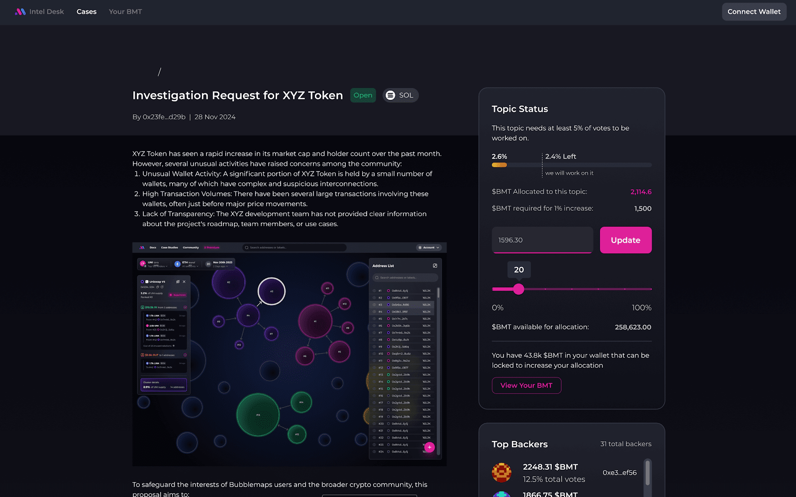 除了高级分析工具,Intel Desk是BubbleMaps让社区深度参与链上调查的核心功能,BMT在其中发挥重要作用: