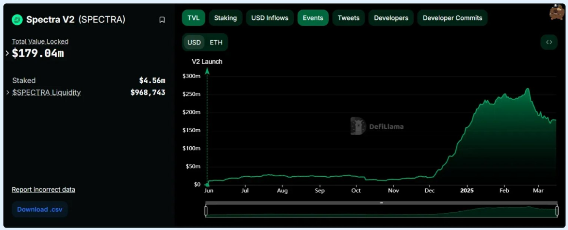 在 1 月初达到峰值后,SPECTRA 的价格开始下降,到 3 月稳定在 0.04-0.05 美元左右,而 TVL 仍稳定在 1.5 亿美元以上。这表明最初的价格飙升可能已经超过了使用量和费用产生的速度,市场会相应地调整预期。