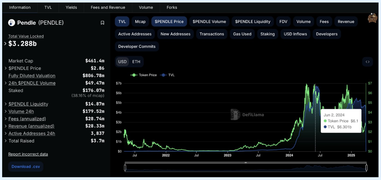 即使到了 2025 年初,当 Pendle 的 TVL 在 35 亿美元和 50 亿美元之间波动时,代币仍保持在几美元的范围内。这表明市场仍在定价未来的上行空间,而不仅仅是当前的 TVL。