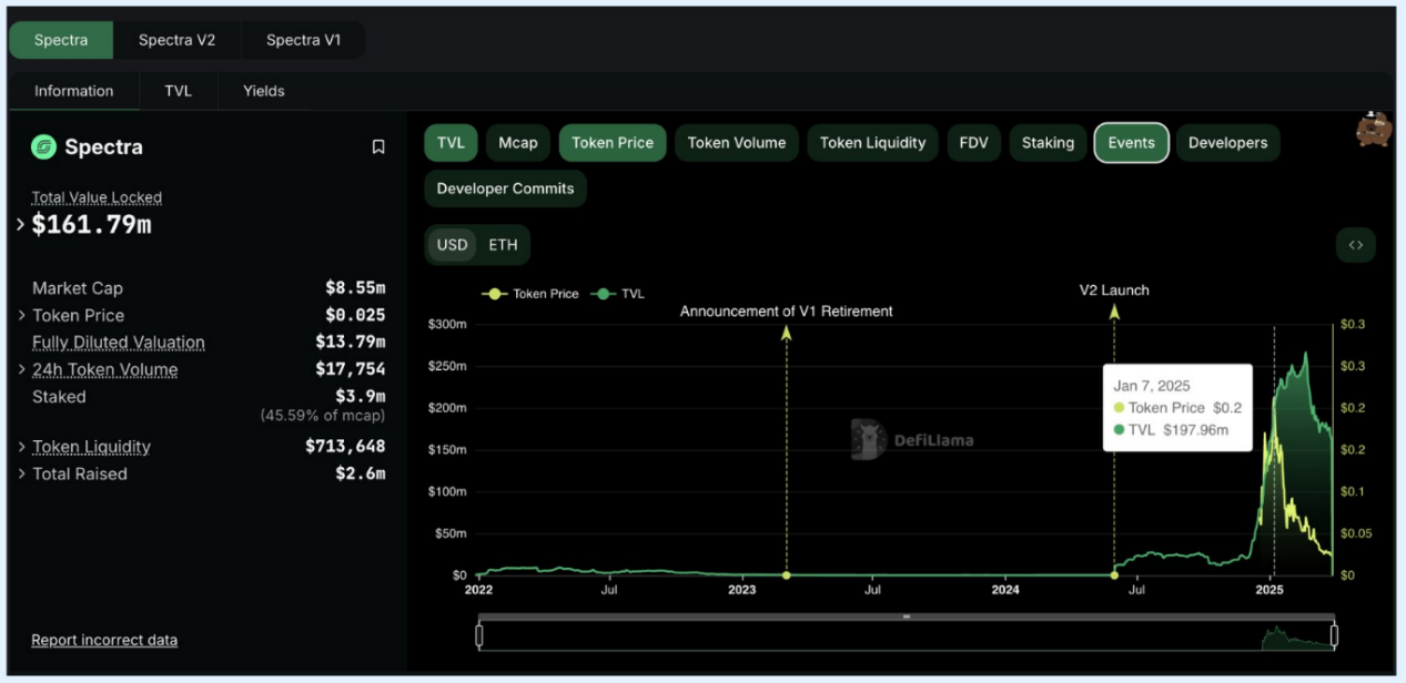 SPECTRA 代币价格与 TVL 对比
