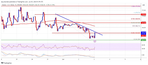 6月3日的最新消息是,索拉纳的价格再次下跌,触及了160美元的支撑区域。目前,价格正在盘整,如果能突破166美元的阻力位,可能会出现回升的迹象。