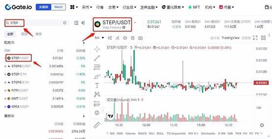 5、输入币种简称STEP,选择STEP/USDT,即可查看STEP行情。