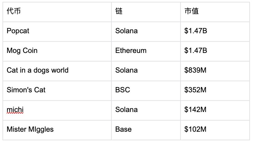 上表展示了截至 2024 年 12 月 9 日的顶级猫主题 Memecoins 及其相应的市值。在六种猫币中,Mister Miggles 明显处于落后状态,仍需追赶。根据 Coinbase 的公告,他们计划将 10 亿用户引入链上。Base 目前拥有 1500 万用户,而 Mister Miggles 的市值为 1.02 亿美元。如果 Coinbase 只实现目标的 20%,用户增长将达到 13 倍,那么 1.02 亿美元的估值可能被低估了。