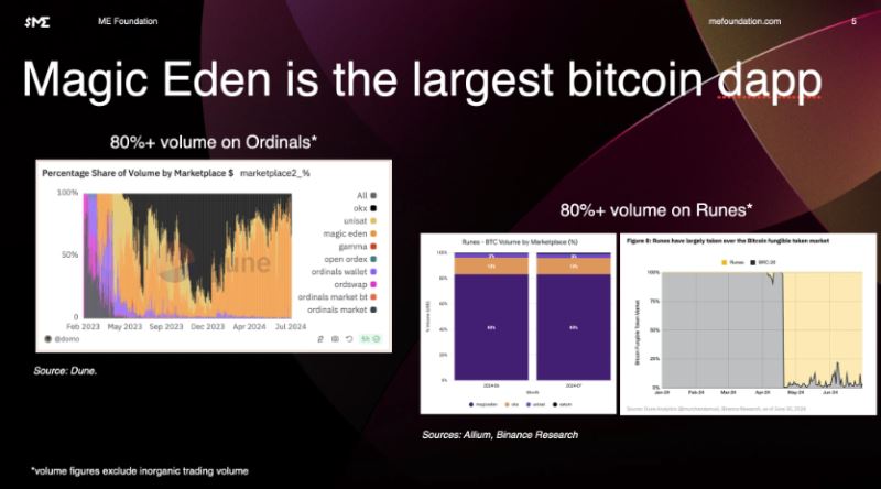 从技术角度来看,Magic Eden是比特币生态系统中最大的DApp,它们处理80%的Ordinals和Runes交易。