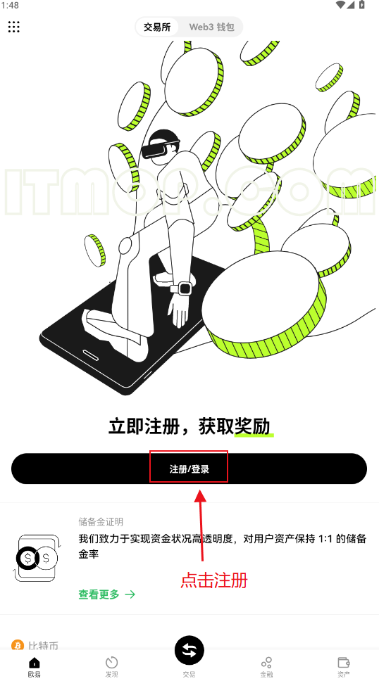 7. 在首页点击“买币”,选择“快捷买币”或“C2C买币”