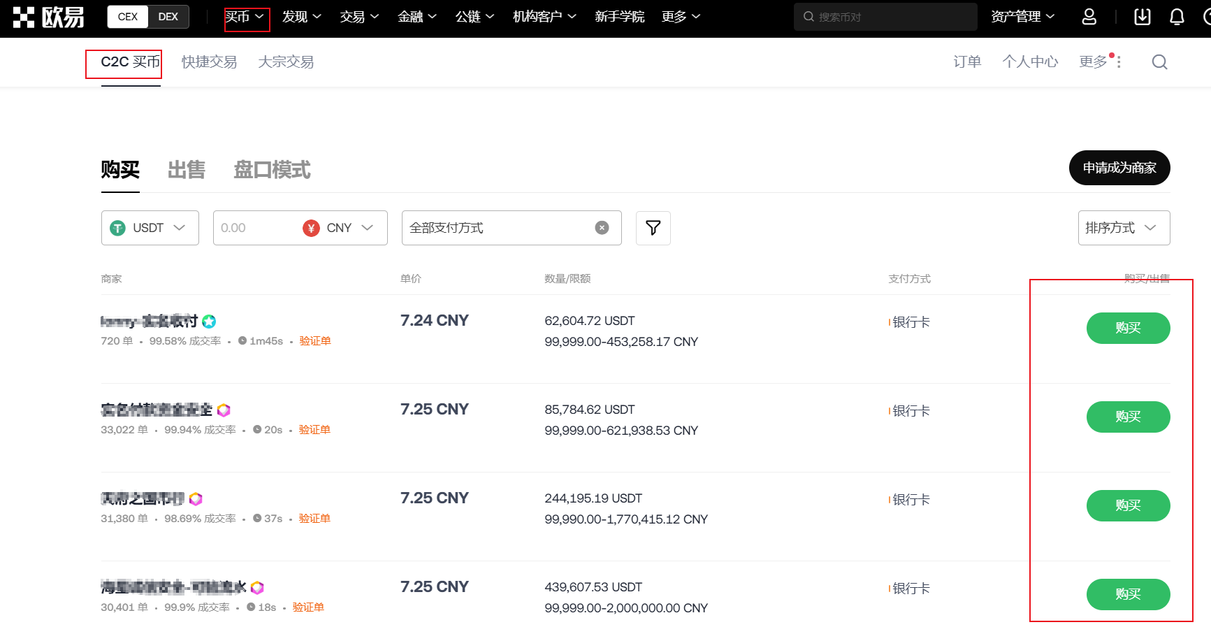 8. 如果选择“C2C买币”,选择信誉良好的商家,注意看清楚单价和限额