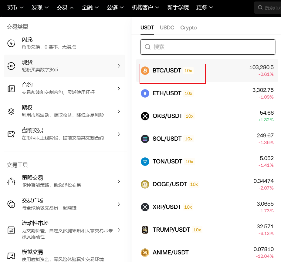 11. 在搜索框中输入“BTC”,选择BTC/USDT交易对