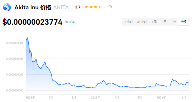 Akita Inu当前价格为$0.00000023774。在过去24小时内,Akita Inu的价格上涨了+0.34%。目前,Akita Inu在市值排名中位居第247位,实时市值为$2,378.00万,流通供应量为100,000,000,000,000 AKITA,最大供应量为0 AKITA。我们会实时更新Akita Inu/USD的价格。
