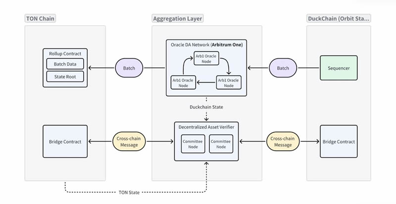 DuckChain 可以被看作运行在 Arbitrum One 上的类似 L3 的 Orbit 网络,但其节点具有额外的功能,以确保与 TON 区块链的通信。