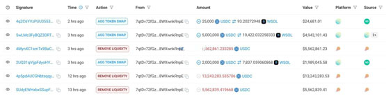 值得注意的是,根据Solscan的数据,川普团队用于加入TRUMP单边流动性池的地址7qtDv7…nkRnpE今日已将约700万枚USDC通过Jupiter兑换成27,259.09枚SOL,随后全部转移至OKX。这些用于购买SOL的USDC,都是从其部署的TRUMP单边流动性池中取出的。